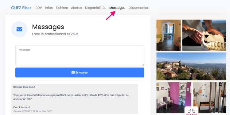 2. Cliquez sur l’onglet « Messages« . Ils seront visibles uniquement par vous et par vos ostéopathes. Merci de préciser si votre message est à l’attention de Mme Kermorgant ou de Mme Guez.